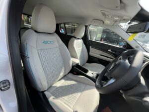 ラ・プリマ専用の高級感: 最上級グレード「ラ・プリマ」は、アイボリーのエコレザーシートにフィアットのロゴが刺繍されており、まるで高級家具のような内装です。